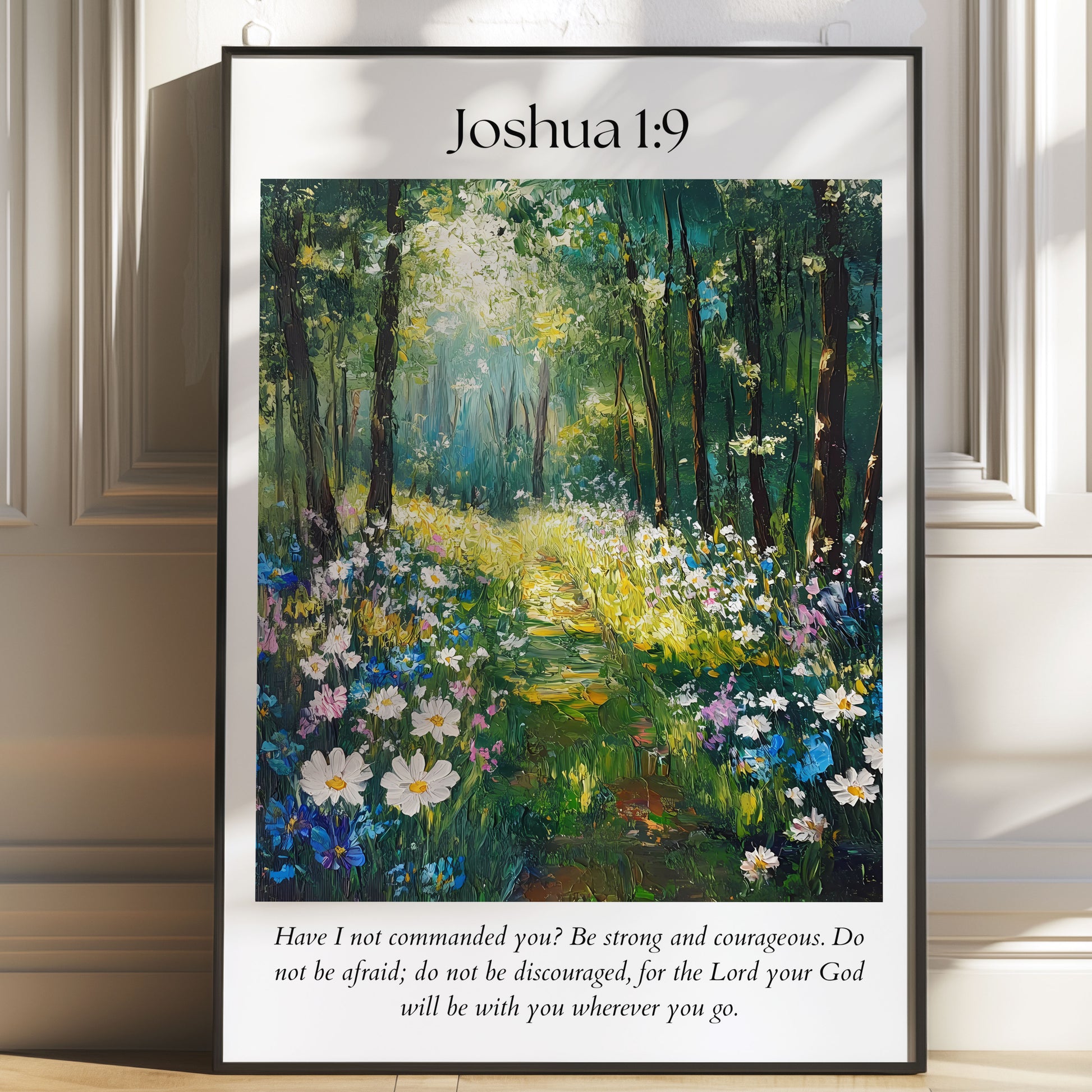 This Joshua 1:9 print captures the way courage can feel—like sunlight breaking through the trees after a long stretch of shade. The vibrant path through the forest echoes the verse’s promise that strength grows when you remember you’re never walking it alone.