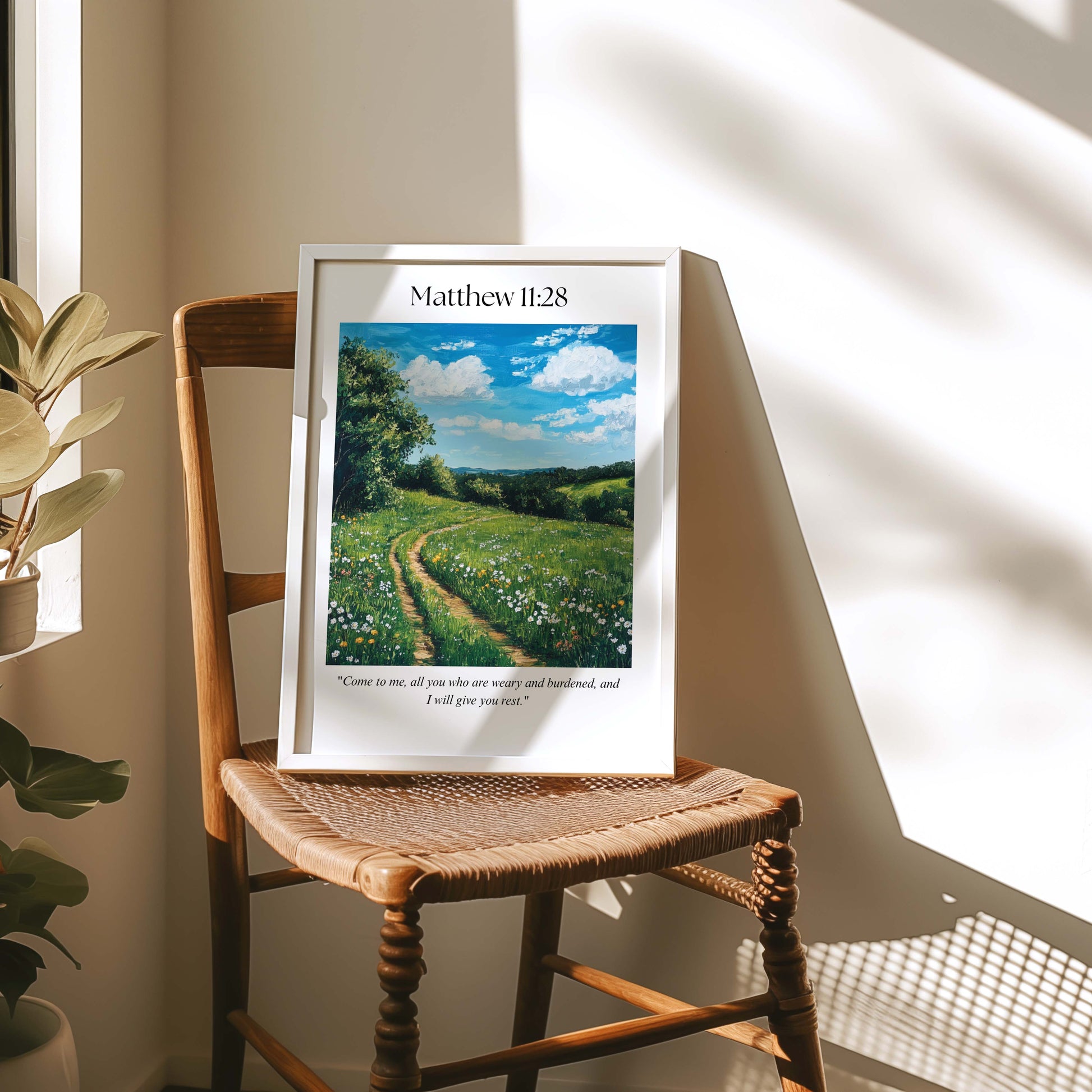 This Matthew 11:28 Scripture print brings a sense of calm with its bright meadow and gentle path. It reflects Jesus’ invitation to lay your burdens down and find true rest in Him. A soothing piece of Christian wall art for any space.