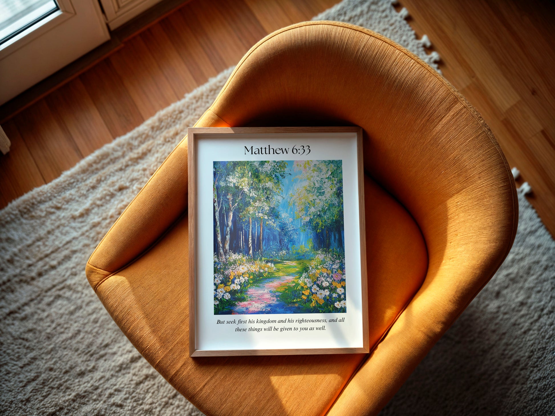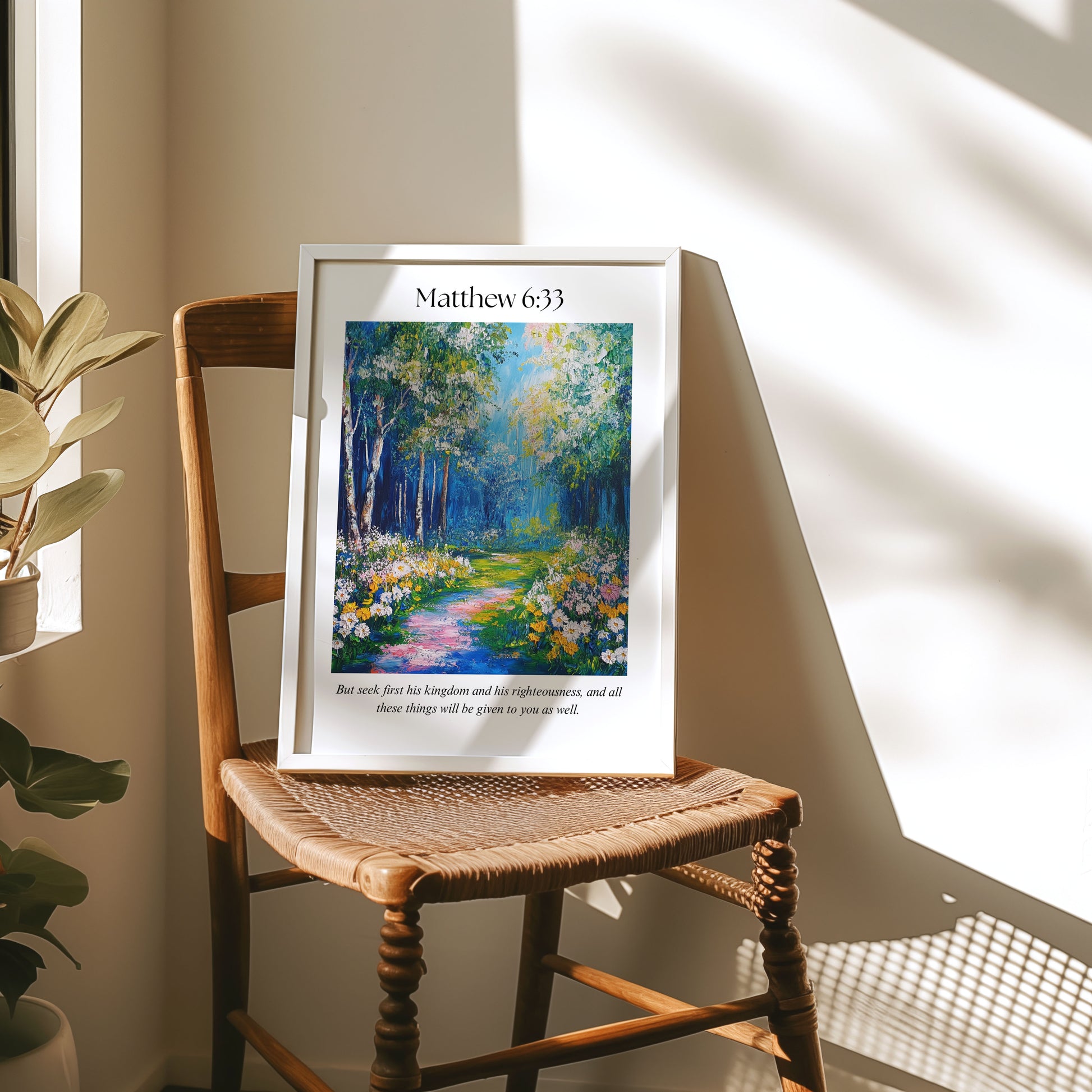 This piece captures the quiet assurance of Matthew 6:33. The vibrant path and gentle greenery reflect the truth that when you begin with God, He meets your needs in ways you couldn’t plan on your own.