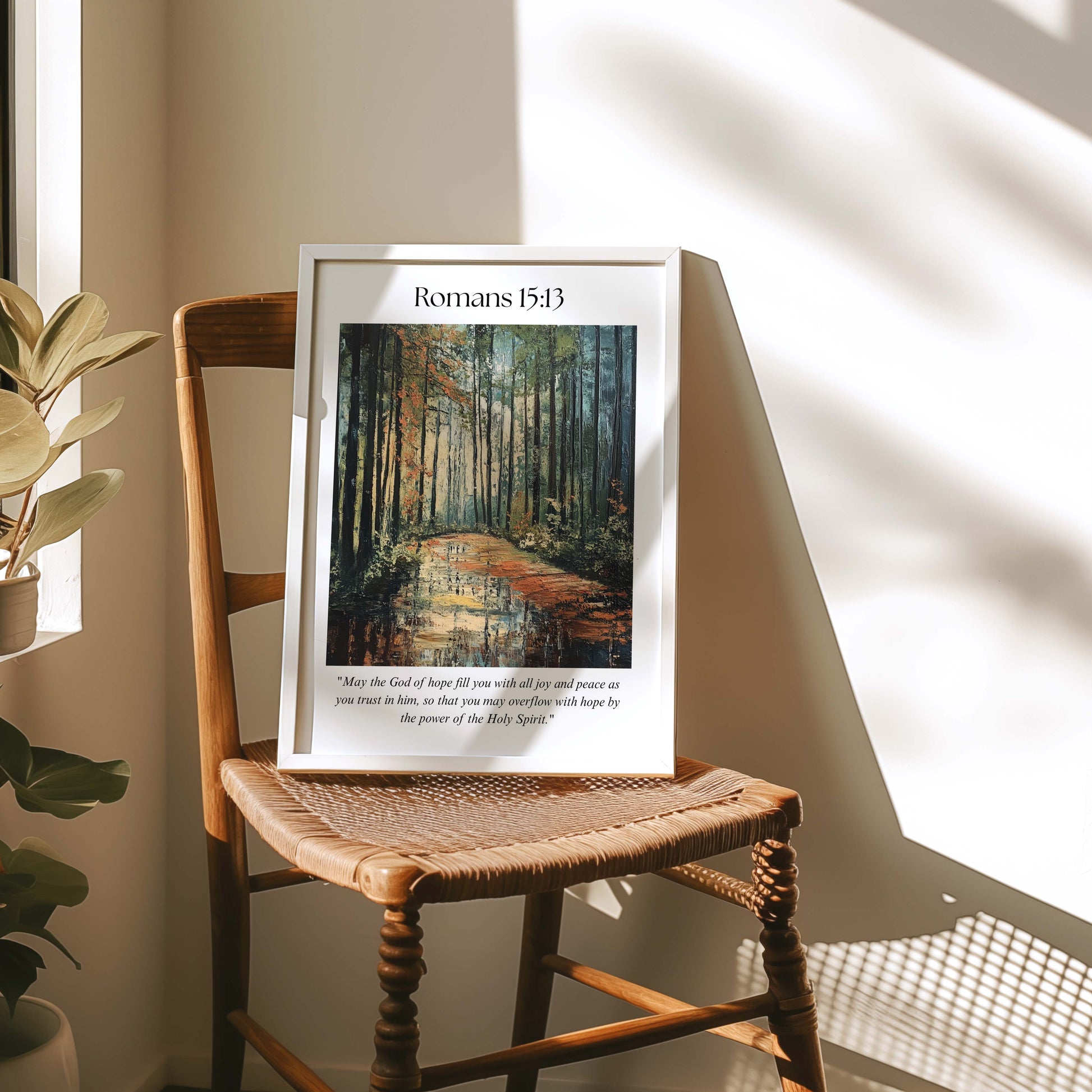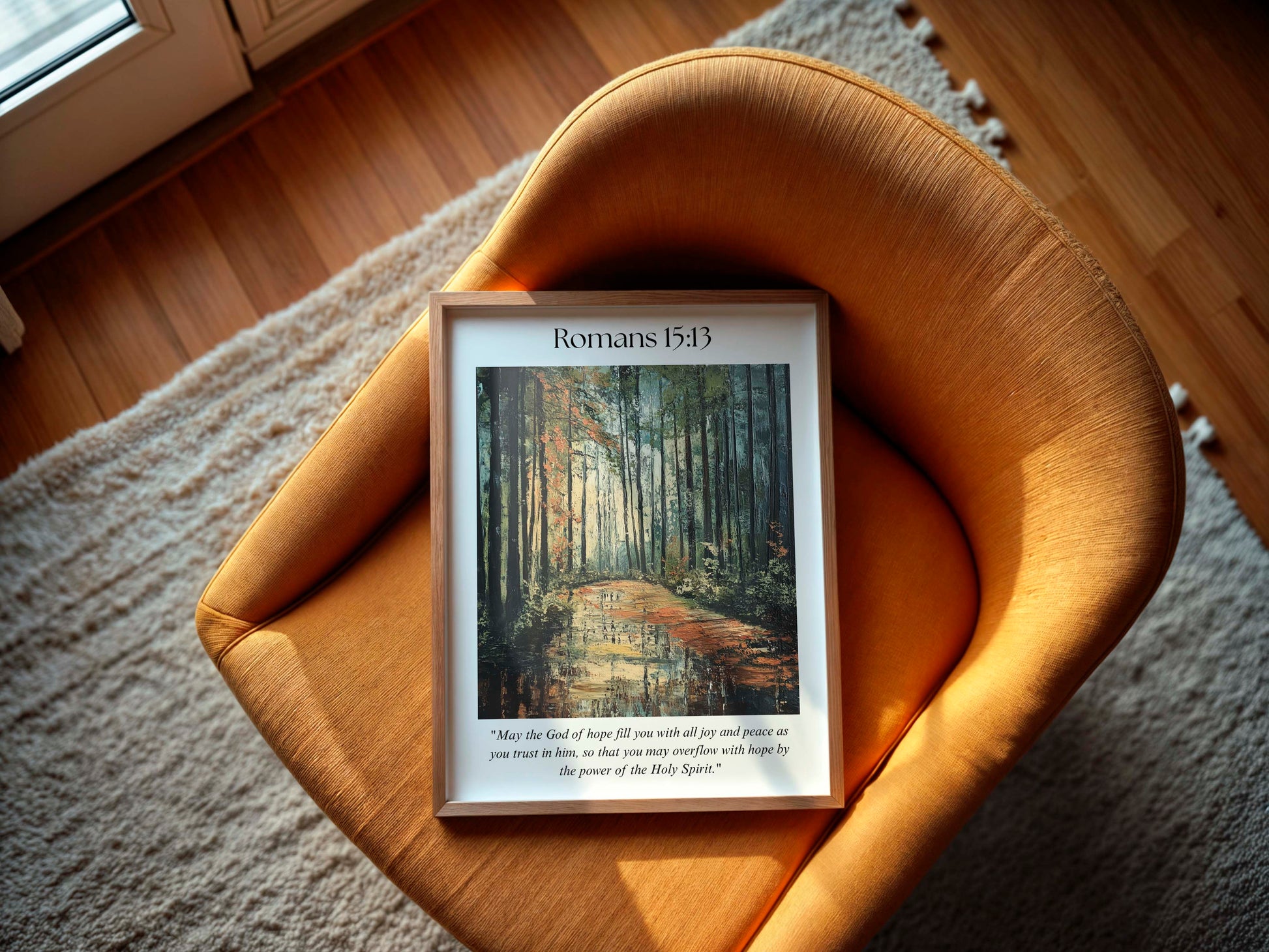 This Romans 15:13 Christian wall art captures the peaceful beauty of trusting God. The warm forest tones and soft reflections echo the verse’s promise of joy and hope that grows as you lean on Him. It’s a calming piece of faith decor that brightens any room with encouragement.